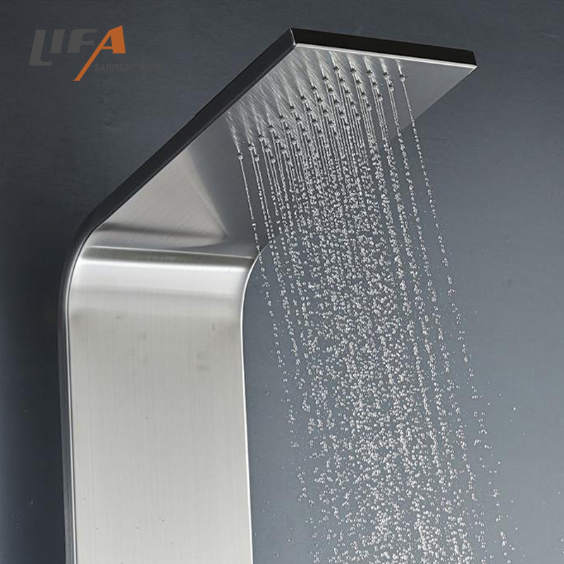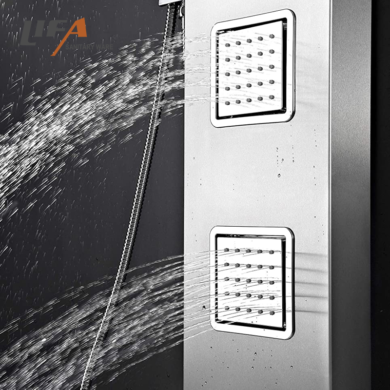B2b bathroom sanitary product enjoy shower Hydrating lifa stainless steel shower panel MaterialStainless steel shower panelHead showerPlastic head shower, rainfallHand showerSingle function chrome plastic hand showerShower holderChrome finished, plastic shower holderMassage jetsChrome finished, plastic massage jetsCartridgeBrass body ceramic plate LIFE: 500000 timesHandlesOne for diverter, one for mixer, chrome zincWoven hose304# stainless steel wire woven hoseShower hoseStainless steel double-lock hose, 1.5MMounting kitsStainless steel hanging pieces