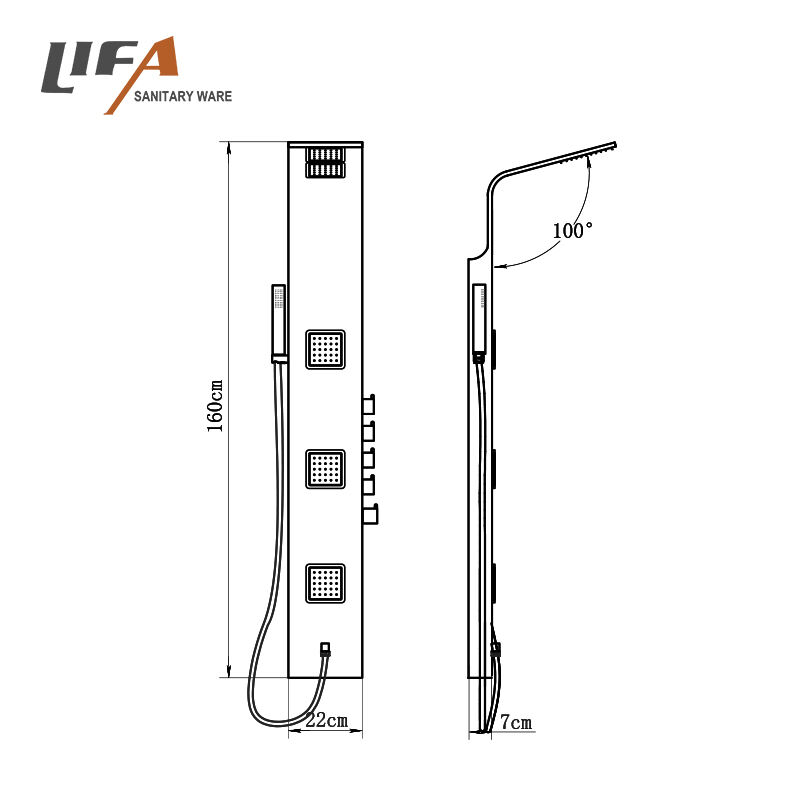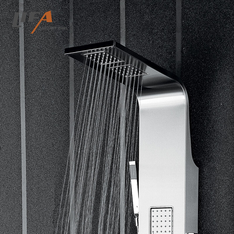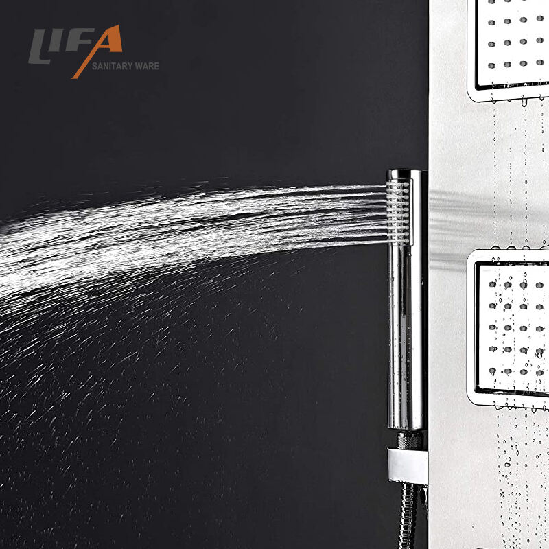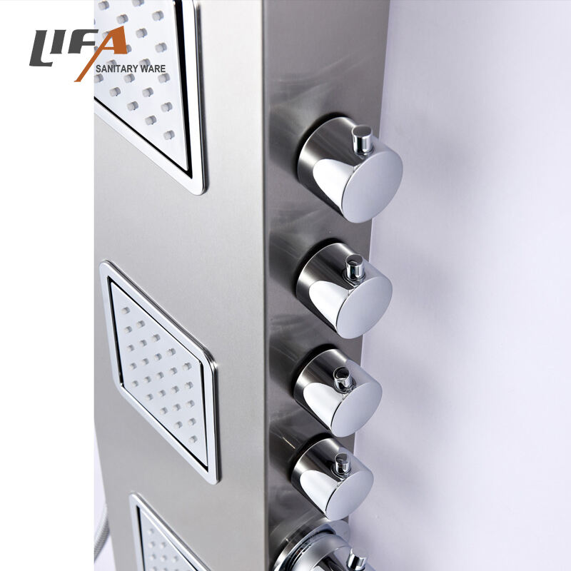 Bathroom accessories comfortable hot and cold water mixer stainless steel shower panel CF-8011 MaterialStainless steel shower panelHead showerPlastic head shower, rainfallHand showerSingle function chrome plastic hand showerShower holderChrome finished, plastic shower holderMassage jetsChrome finished, plastic massage jetsCartridgeBrass body ceramic plate LIFE: 500000 timesHandlesOne for diverter, one for mixer, chrome zincWoven hose304# stainless steel wire woven hoseShower hoseStainless steel double-lock hose, 1.5MMounting kitsStainless steel hanging pieces