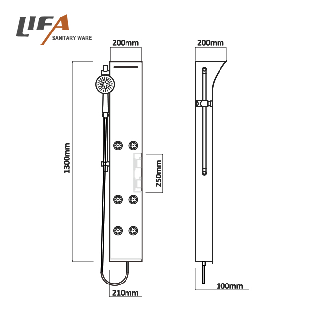 Modern design wall-mounted aluminum alloy shower panel bathroom shower set ModelCF-9230MaterialAluminum alloy shower panelHead showerplastic head shower, waterfallHand showerMultifunctional chrome plastic hand shower Shower holderChrome finished, plastic shower holderMassage jetsChrome finished, plastic massage jetsCartridgeBrass body ceramic plate LIFE: 500000 timesHandlesOne for diverter, one for mixer, chrome zincWoven hose304# stainless steel wire woven hoseShower hoseStainless steel double-lock hose, 1.5MMounting kitsStainless steel hanging pieces