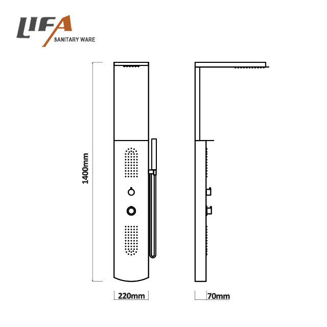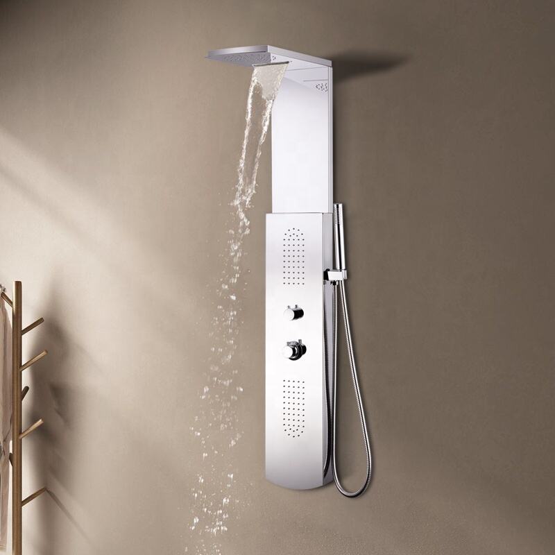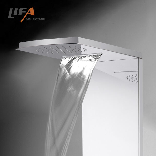 Fashion design good quality shower faucet water mixer shower panel MaterialTempered glass shower panelHead showerplastic head show, 5*10 nozzlesHand showerSingle function chrome plastic hand showerShower holderChrome finished, plastic shower holderMassage jetsChrome finished, plastic massage jetsCartridgeBrass body ceramic plate LIFE: 500000 timesHandlesOne for diverter, one for mixer, chrome zincWoven hose304# stainless steel wire woven hose, 0.5MEPDM inner hose (nonpoisonous, tasteless, high temperature resistance)Shower hoseStainless steel double-lock hose, EPDM inner hose, 1.5MMounting kitsStainless steel hanging pieces