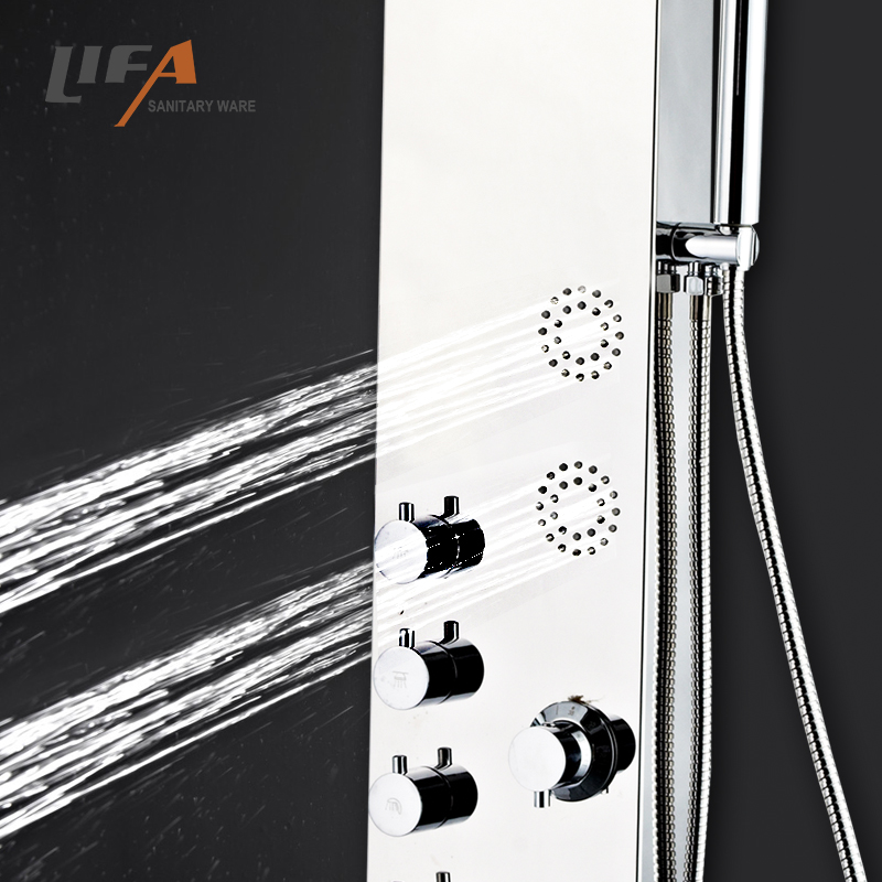 Highly adaptable summer is coming update technology stainless steel shower panel CF-8212 MaterialStainless steel shower panelHead showerPlastic head shower, rainfallHand showerSingle function chrome plastic hand showerShower holderChrome finished, plastic shower holderMassage jetsChrome finished, plastic massage jetsCartridgeBrass body ceramic plate LIFE: 500000 timesHandlesOne for diverter, one for mixer, chrome zincWoven hose304# stainless steel wire woven hoseShower hoseStainless steel double-lock hose, 1.5MMounting kitsStainless steel hanging pieces