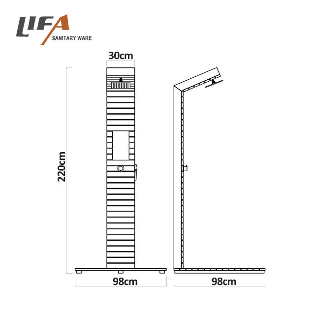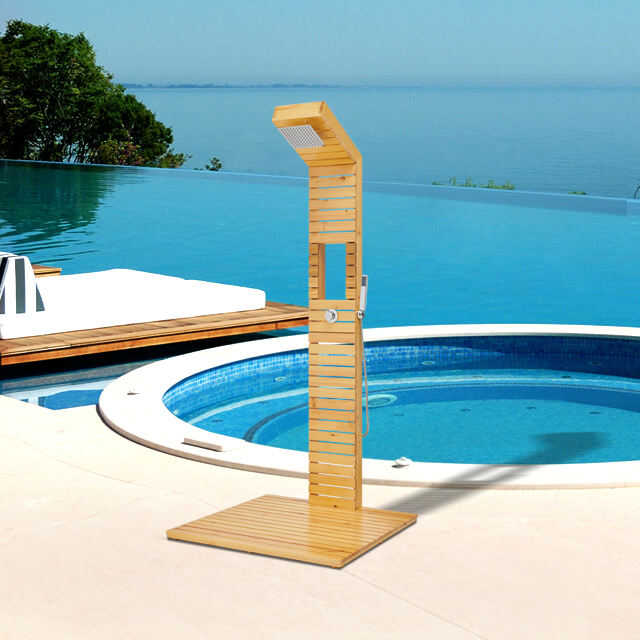 Hot sale sanitary ware free-standing outdoor floor stand wood shower panel for beach garden CF-5005 ItemValueProduct NameWood outdoor shower panelModel NumberCF-5005Size980*980*2200mmMaterialWoodFunctionShowerFeatureFloor Stand FaucetsApplicationBathroom, outdoor poolDesign StyleModernWarranty2 year