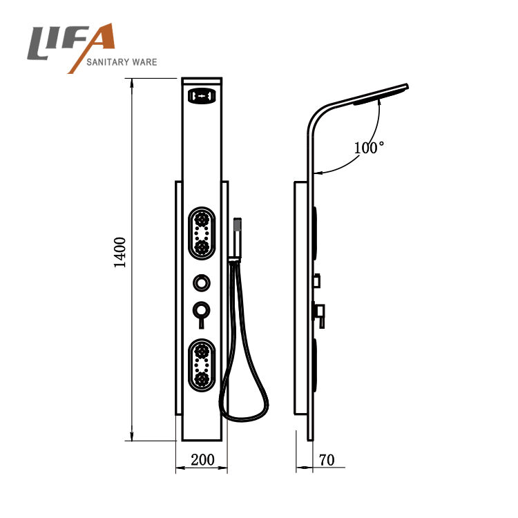 Product NameAluminum alloy shower panelModel NumberCF-9029Size1400*200*70mmMaterialAluminum alloyHead showerPlastic head shower, rainfall Hand showerSingle function plastic hand showerMassage jetsChrome Plastic massage jetsWarranty2 year