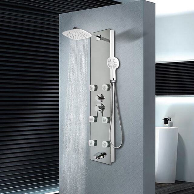 ハイドロマッサージ雨室 壁面雨パネル 長方形デザイン シャワーセット 材料安全 強化ガラスシャワーパネル ヘッドシャワー プラスチックヘッドショー, 21*21CM ハンドシャワー シングル機能 クロムプラスチックハンドシャワー シャワーホルダー クロム仕上げ、プラスチックシャワーホルダー マッサージジェット クロム仕上げ、プラスチックマッサージジェット カートリッジ 真鍮ボディ セラミックプレート ハンドル ダイバータ用1つ、ミキサー用1つ、クロム亜鉛 織りホース 304#ステンレス鋼ワイヤー織りホース、0.5M シャワーホース ステンレス鋼ダブルロックホース、1.5M 取り付けキット ステンレス鋼吊り具