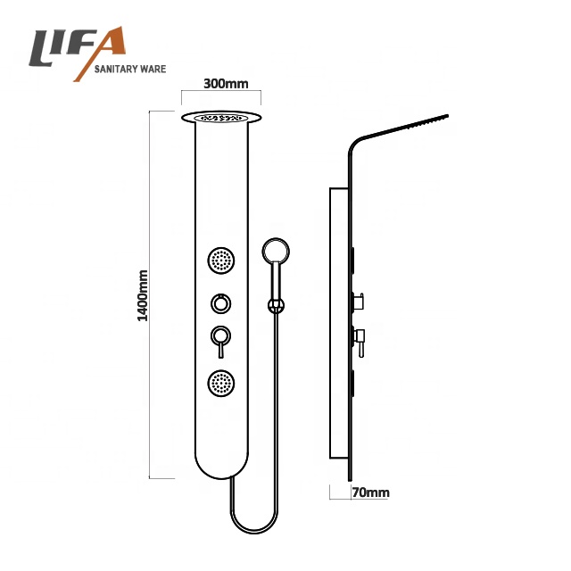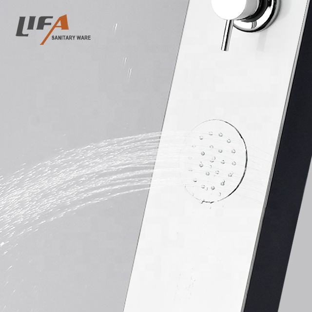 Luxury multifunction easy to use rain shower control system stainless steel shower panel CF-9027 MaterialAluminum shower panelHead showerplastic head shower, rainfallHand showerSingle function chrome plastic hand showerShower holderChrome finished, plastic shower holderMassage jetsChrome finished, plastic massage jetsCartridgeBrass body ceramic plate LIFE: 500000 timesHandlesOne for diverter, one for mixer, chrome zincWoven hose304# stainless steel wire woven hoseShower hoseStainless steel double-lock hose, 1.5MMounting kitsStainless steel hanging pieces