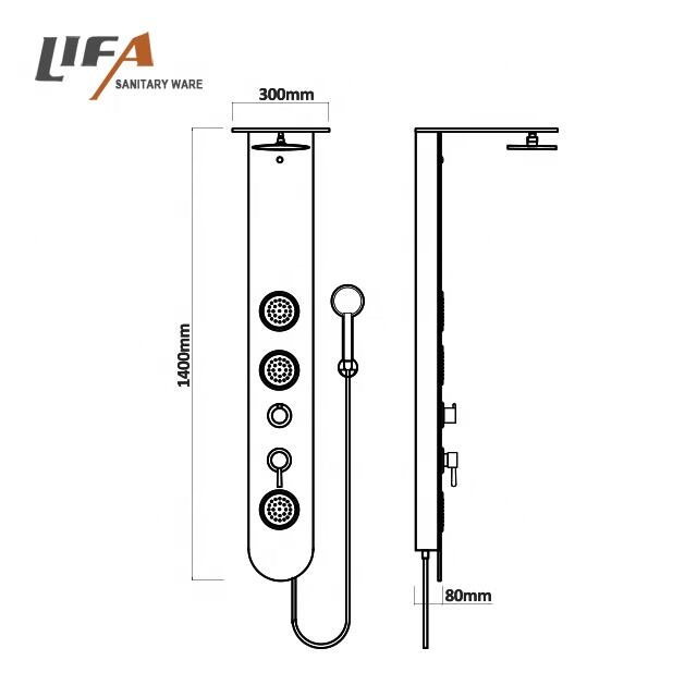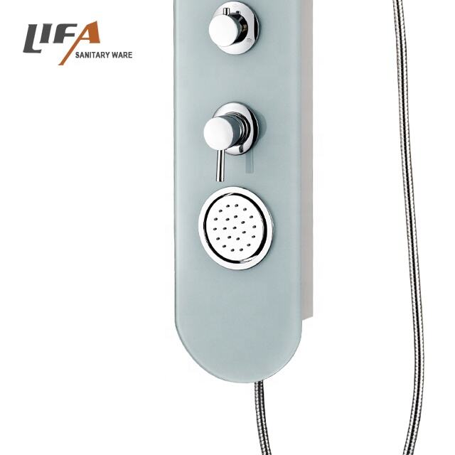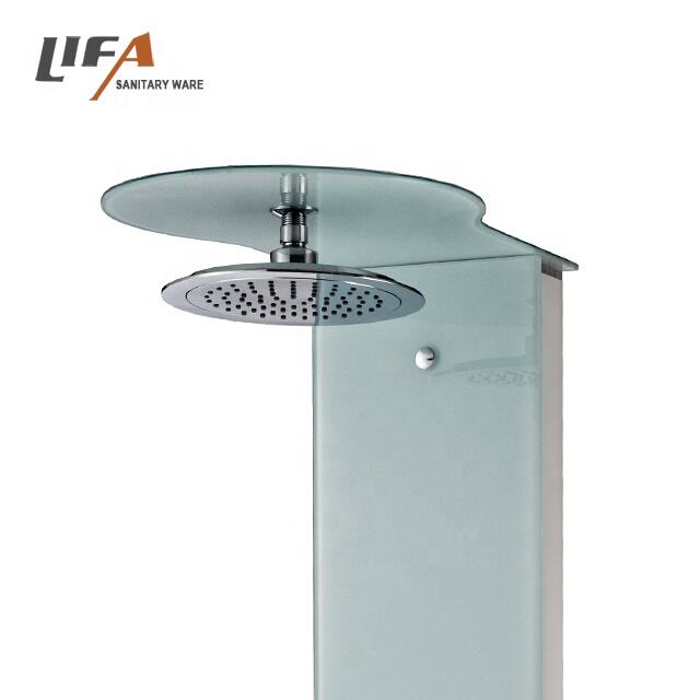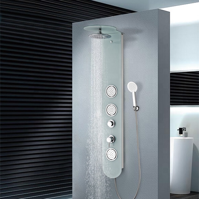 massage bathroom faucet shower set tempered glass shower wall panel de ducha MaterialTempered glass shower panelHead showerplastic head show, 20cmHand showerSingle function chrome plastic hand showerShower holderChrome finished, plastic shower holderMassage jetsChrome finished, plastic massage jetsCartridgeBrass body ceramic plateHandlesOne for diverter, one for mixer, chrome zincWoven hose304# stainless steel wire woven hose, 0.5MShower hoseStainless steel double-lock hose,1.5MMounting kitsStainless steel hanging pieces