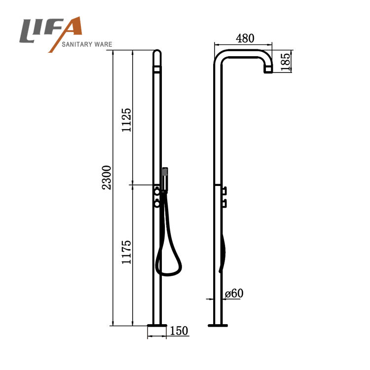 Product NameOutdoor shower columnModel NumberCF5308Sizeø60x2300mmMaterialStainless steel ColorBrush FinishedFunctionRainfall, Hand showerNumber of handlesDual HandleFeatureFloor Stand FaucetsApplicationBathroom, outdoor poolWarranty2 year