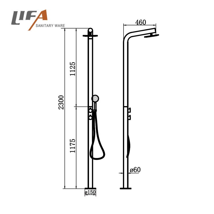 Product NameOutdoor shower columnModel NumberCF5310Sizeø60x2300mmMaterialStainless steel ColorBrush FinishedFunctionRainfall, Hand showerNumber of handlesDual HandleFeatureFloor Stand FaucetsApplicationBathroom, outdoor poolWarranty2 year