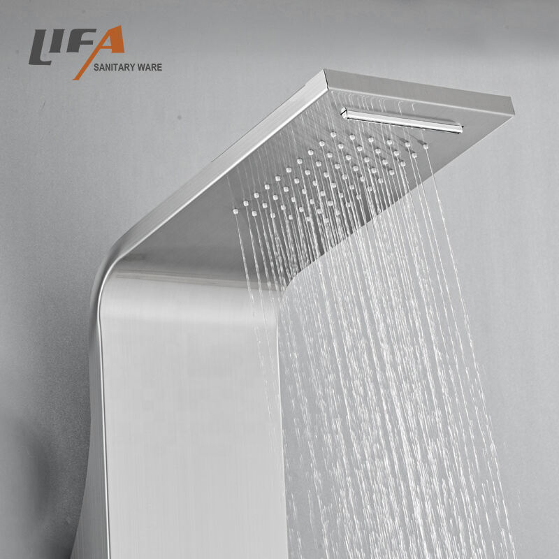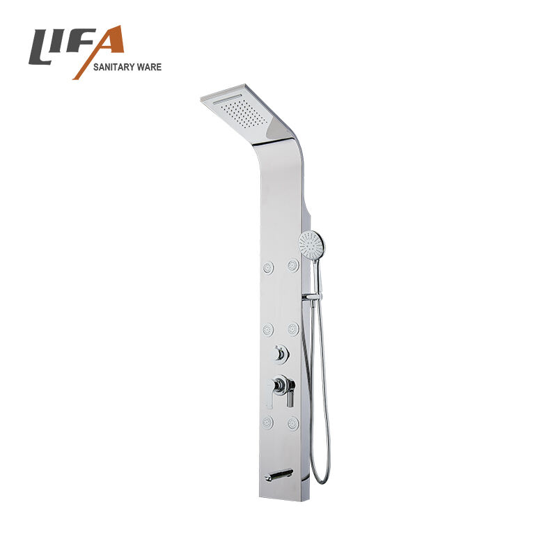 Shower mixer set bathroom massage jets stainless steel wall mounted shower panel CF-8023Product NameSS shower panelModel NumberCF-8023Size1500*200*70mmMaterialStainless steelHead showerplastic head shower, waterfall, rainfallHand showerMultifunctional chrome plastic hand showerShower holderChrome finished, plastic shower holderMassage jetsChrome finished, plastic massage jetsWarranty2 year